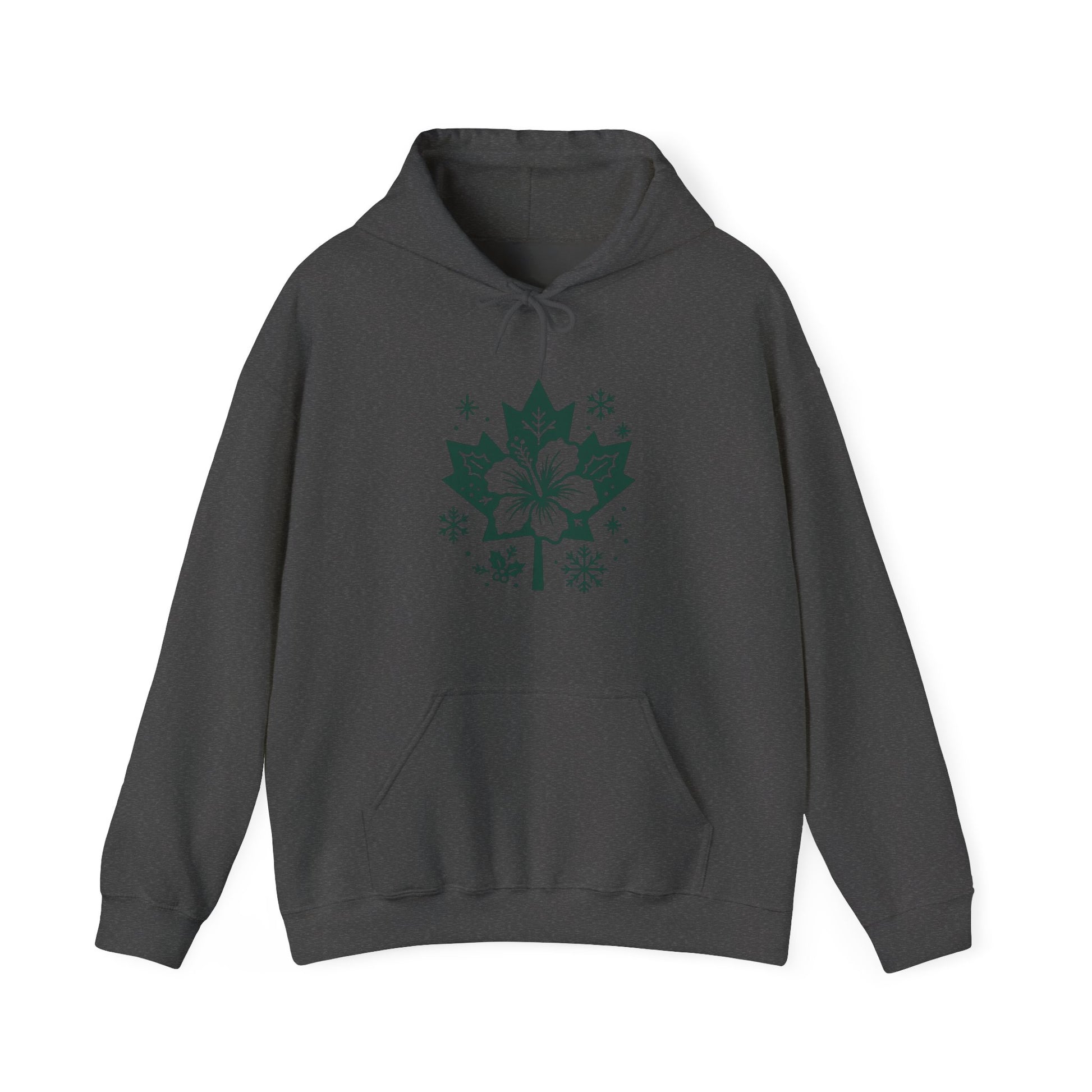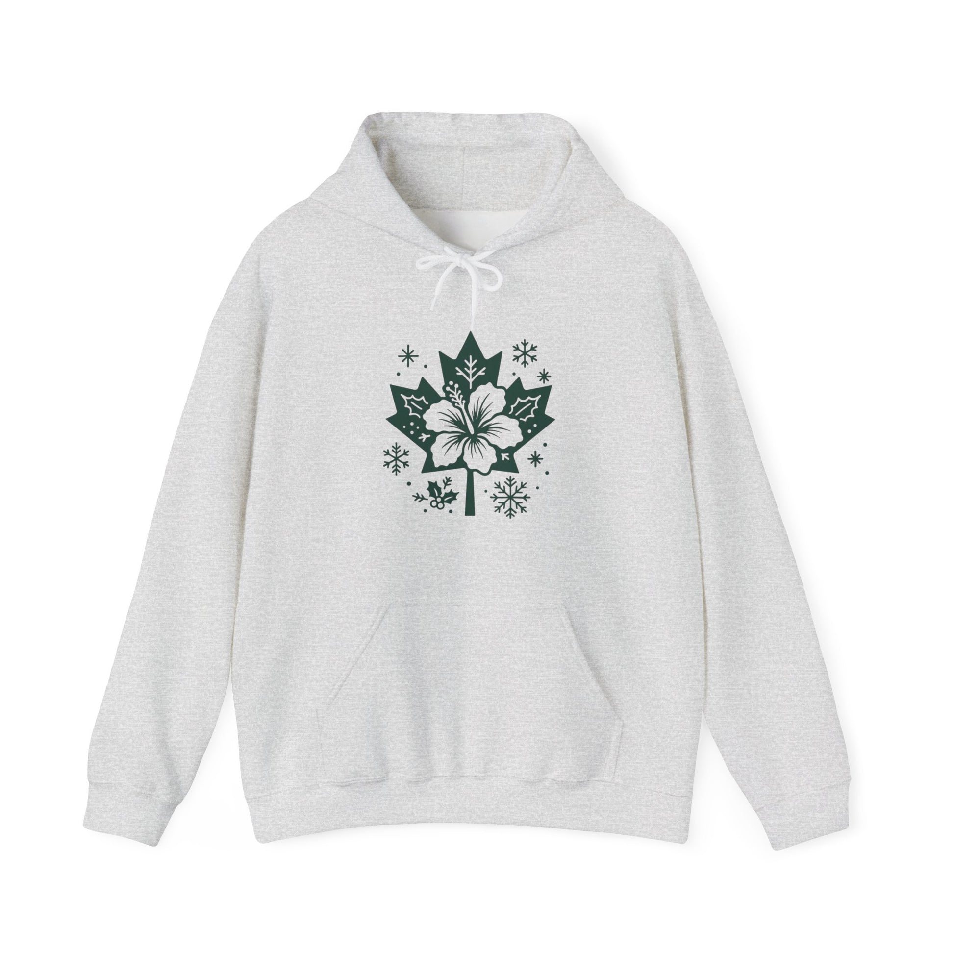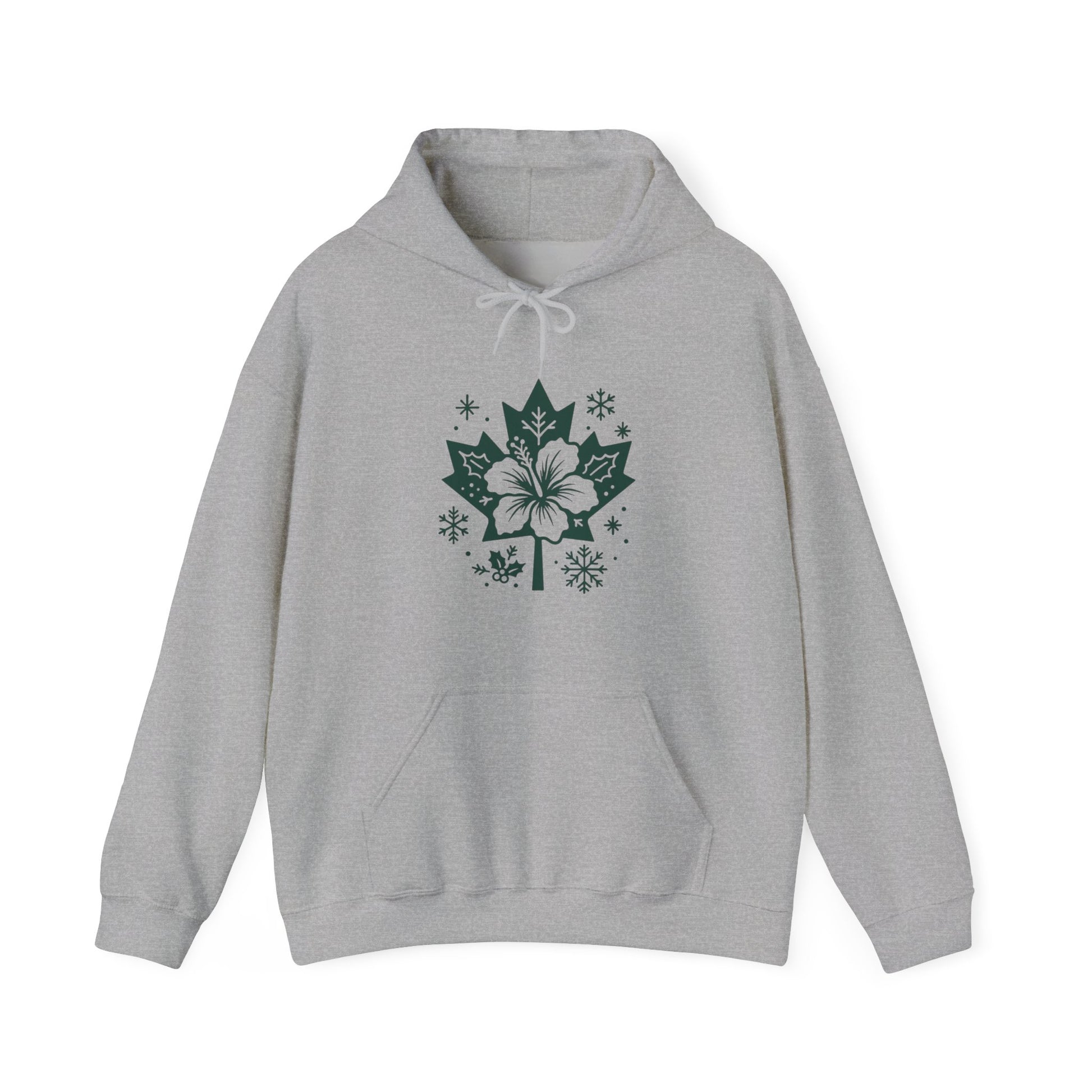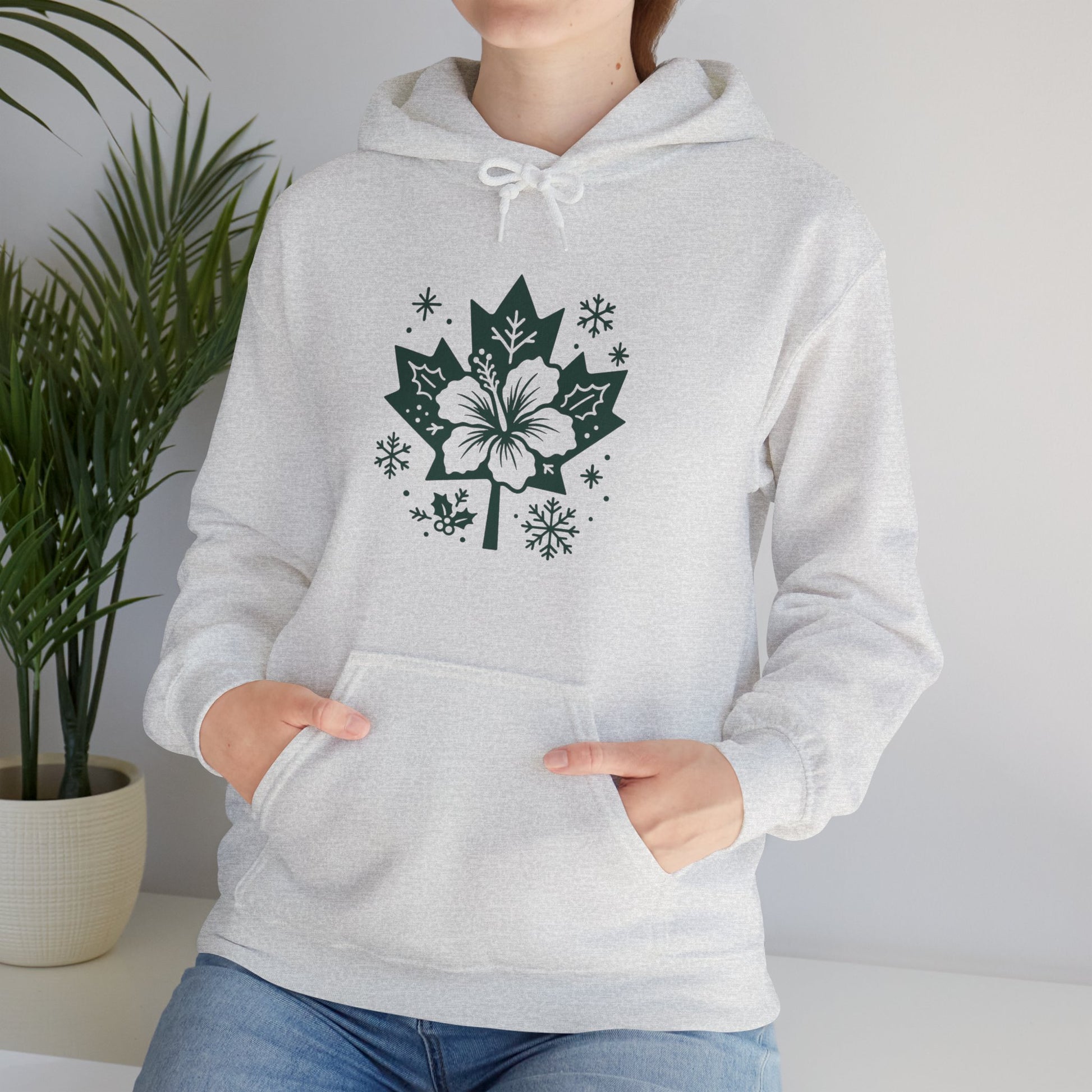 Soft, warm, and quietly festive — this hoodie pairs cozy comfort with a subtle winter-botanical design. A stylized maple-leaf silhouette frames a delicate poinsettia and scattered snowflakes, rendered in deep green on a clean white background. The roomy kangaroo pocket, color-matched drawcord, and double-lined hood keep you snug on crisp mornings. Wear it for slow walks through frost-lit streets, evenings by the window with a mug, or casual gatherings when you want seasonal spirit without shouting. The smooth 50/50 cotton–poly blend feels soft against skin and holds print detail beautifully, while tear-away neck labels and a classic fit keep distractions to a minimum. Thoughtful embroidery or DTF sleeve options are available for a more textured finish.